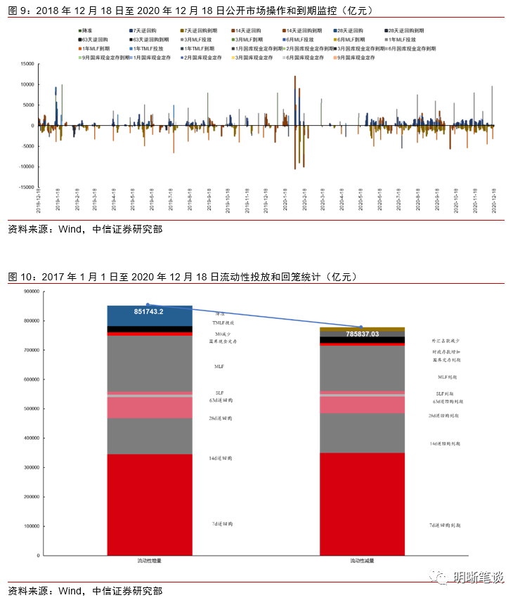 我们对市场流动性情况进行跟踪,观测2017年开年来至今流动性的“投与收”。增量方面,我们根据逆回购、SLF、MLF等央行公开市场操作、国库现金定存等规模计算总投放量;减量方面,我们根据2020年11月对比2016年12月M0累计增加13289.74亿元,外汇占款累计下降7788.46亿元、财政存款累计增加19412.53亿元,粗略估计通过居民取现、外占下降和税收流失的流动性,并考虑公开市场操作到期情况,计算每日流动性减少总量。同时,我们对公开市场操作到期情况进行监控。