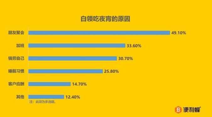 值得一提的是,《白领夜宵报告》指出,有接近一半的报告受访者表示吃夜宵的原因是朋友聚会,另有14.7%的白领因为客户应酬需要进食夜宵。这说明夜宵已经不再单纯是为了填饱肚子,其“社交属性”越来越明显。
