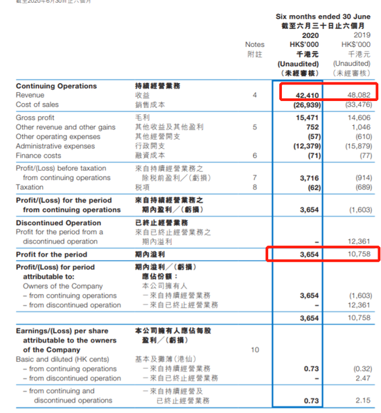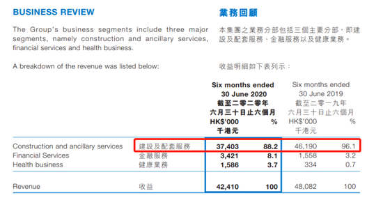 从中期业绩来看,近几年公司要么亏损,要么营收不下滑。截至2020年中期,公司实现收入4241万港元,同比下滑11.8%。公司实现净利365万港元,同比下滑66%。公司最大的业务建设及配套服务收入大幅下滑19%。