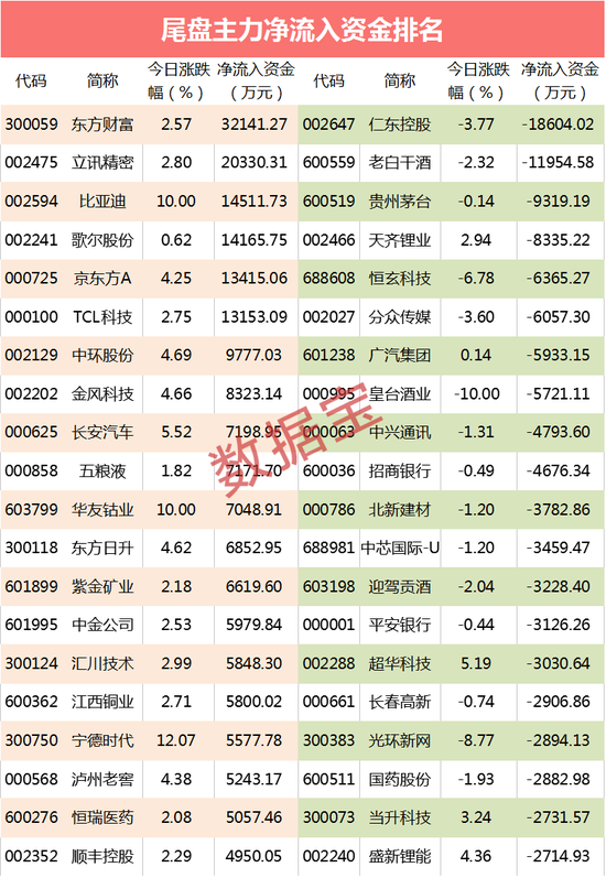 尾盘有6只个股流入资金超亿元,除东方财富外,其他5股均为科技股,包括立讯精密、比亚迪、歌尔股份、京东方A、TCL科技。立讯精密尾盘流入资金超2亿元,公司为苹果产业链概念股,消息面上,苹果计划在2021年上半年生产多达9600万部iPhone,同比增长近30%。