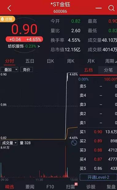 值得注意的是,原本在上周四(12月17日)盘中,投资者已预期*ST金钰会提前锁定面值退市,但当天尾盘该股股价却奇迹般急速拉涨停,侥幸“逃过一劫”。
