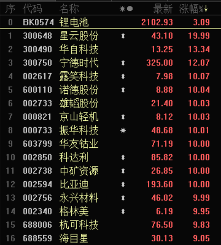 锂电池板块爆发,板块内逾10只个涨超9%,趋势个股迎来加速,龙头宁德时代大涨12%,市值站上7000亿,星云股份、诺德股份、华友钴业等个股涨停。