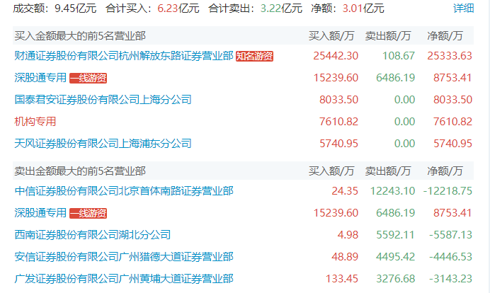 盘后龙虎榜显示,各路资金抢筹格林美,资金净流入超3亿。席位方面,顶级游资财通证券杭州解放东路、国泰君安证券上海分公司合计买入3.33亿;深股通买入1.52亿同时卖出6486万;此外,机构也买入7610万。