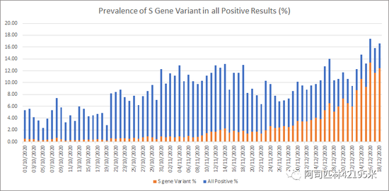 下面这张图是英国一个实验室10月1号到12月18号的的测试结果,金黄色的是突变病毒的百分比,可以看出这种毒株已经占领高地了。
