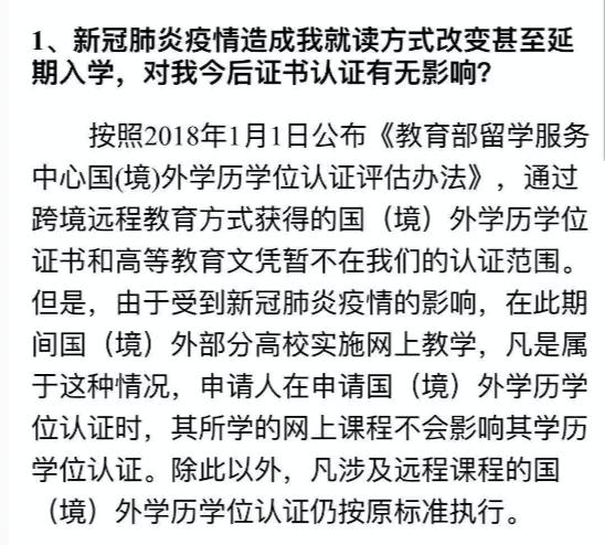 接着,记者发送邮件询问留服认证中心,收到的自动回复称:“由于受到新冠肺炎疫情的影响,在此期间国(境)外部分高校实施网上教学,凡是属于这种情况,申请人在申请国(境)外学历学位认证时,其所学的网上课程不会影响其学历学位认证。除此以外,凡涉及远程课程的国(境)外学历学位认证仍按原标准执行。”