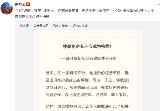 12月21日晚,宋方金、余飞等人发布111位编剧、导演、制片人、作家的联名信,信中指出,相关从业者反对曾有抄袭行为的于正、郭敬明频繁出现在综艺节目中进行话题炒作以此博取收视率和点击率,呼吁不要给抄袭剽窃者提供舞台。联合署名的还有琼瑶、高群书、白一骢、董润年等。
