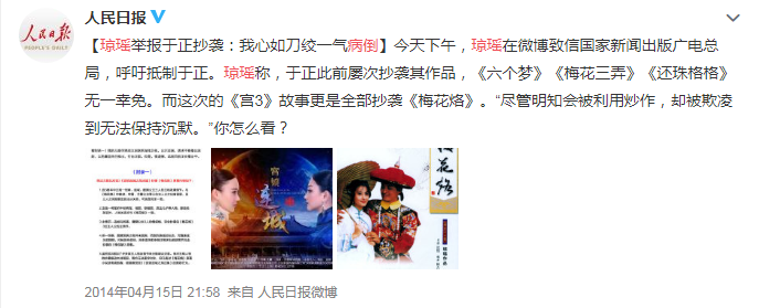 2014年4月15日,琼瑶在微博发表给当时的广电总局的公开信中,举报于正《宫锁连城》多处剧情抄袭《梅花烙》,并列举了几个于正的抄袭案例作为证据,她恳请广电总局领导即时停止播出于正新剧《宫3》,并呼吁观众不要看于正剧。
