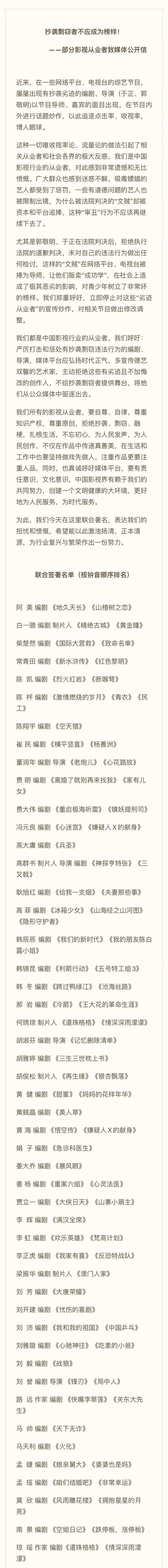 公开信表示,近来,在一些网络平台、电视台的综艺节目,屡屡出现有抄袭劣迹的编剧、导演(于正、郭敬明)以节目导师、嘉宾的面目出现,在节目内外进行话题炒作,以此追逐点击率、收视率,博人眼球。