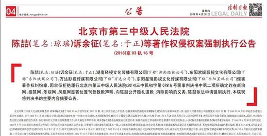 但于正拒不向琼瑶公开道歉,还玩起了消失,手机不通,邮件退回。到了2018年4月,据北京法院网官方微信公众号“京法网事”披露,因余征(于正)拒绝履行法院判决中“向陈喆(琼瑶)公开赔礼道歉、消除影响”的义务,陈喆依法申请强制执行。北京市第三中级法院2018年4月26日对此案进行强制执行,在《法制日报》上刊登判决主要内容,所需费用由余征承担。