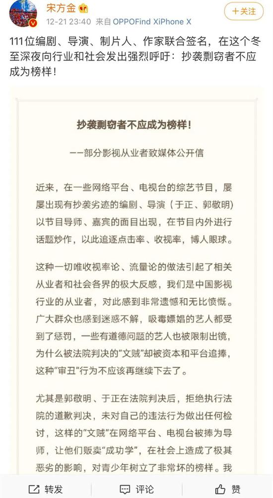 公开信表示,近来,在一些网络平台、电视台的综艺节目,屡屡出现有抄袭劣迹的编剧、导演(于正、郭敬明)以节目导师、嘉宾的面目出现,在节目内外进行话题炒作,以此追逐点击率、收视率,博人眼球。