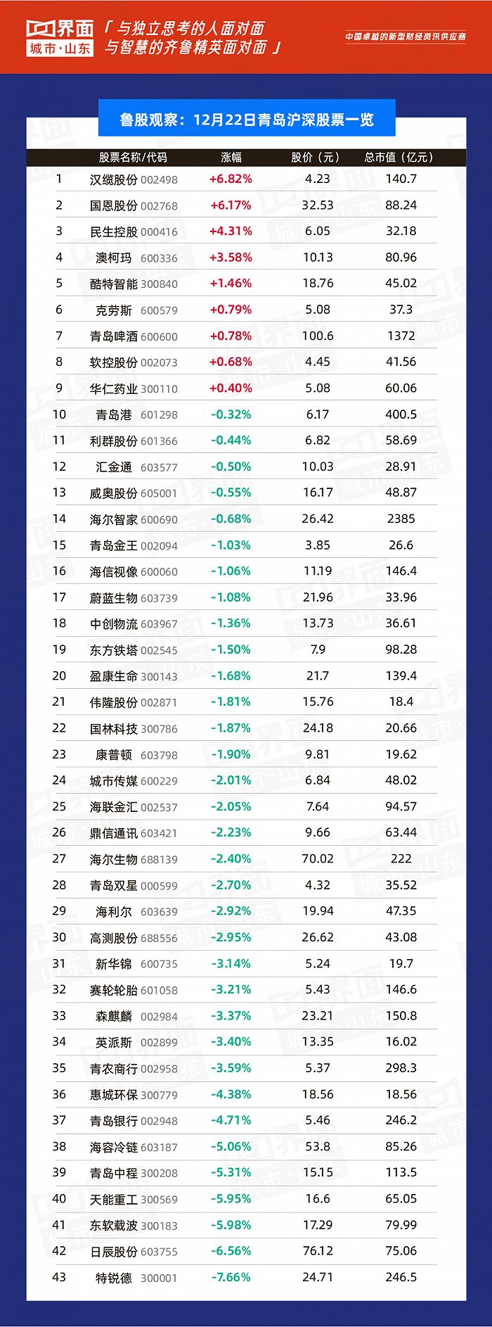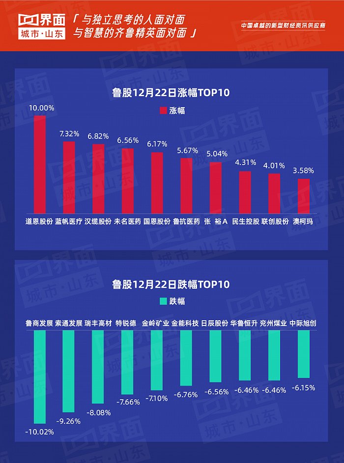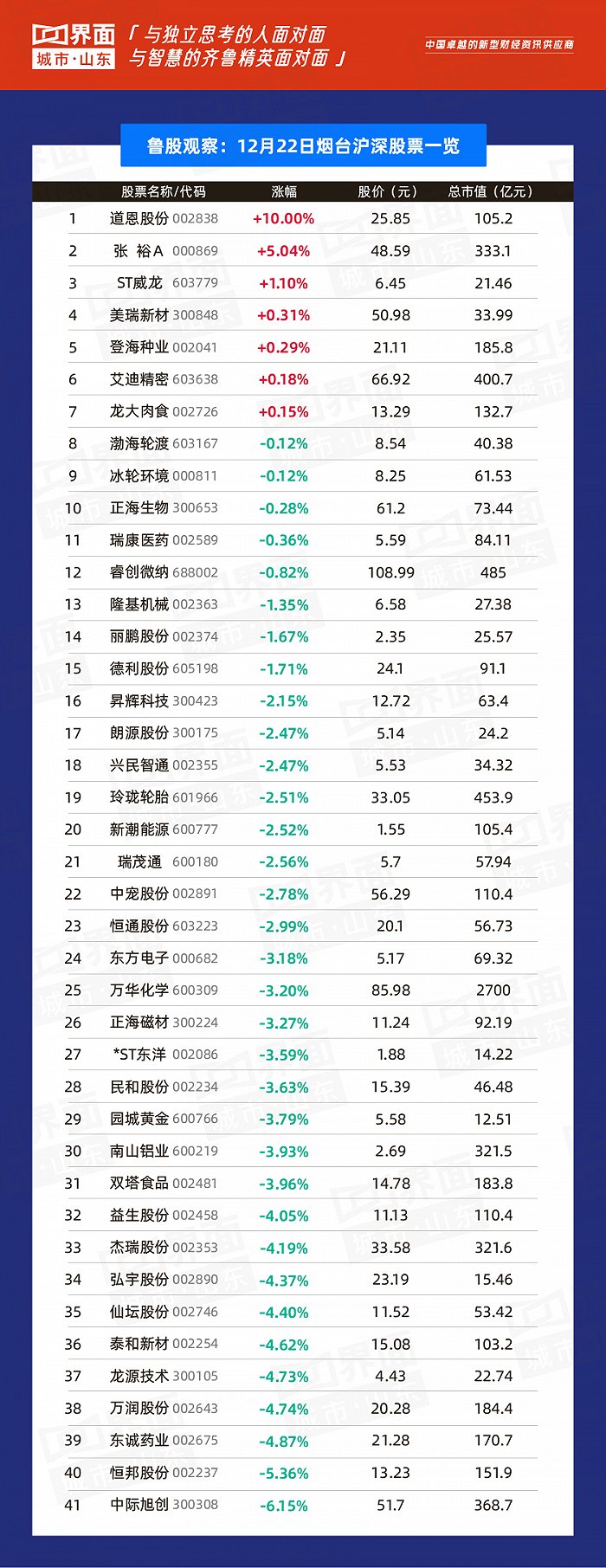 受大盘影响,12月22日,山东38只股上涨,179只股下跌,7只股持平。