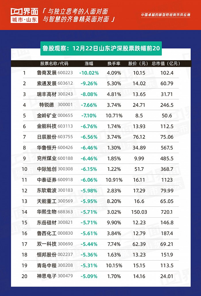 12月22日,鲁商发展跌幅-10.02%,领跌全省。
