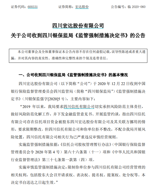 12月22日,四川银保监局官网公布,四川银保监局决定对四川宏达(集团)有限公司、四川宏达股份有限公司、四川濠吉食品(集团)有限责任公司、汇源集团有限公司采取监管强制措施,自2020年12月22日起,限制上述股东参与四川信托经营管理的相关股东权利,即不得行使包括股东(大)会召开请求权、表决权、提名权、提案权、处分权等权利。