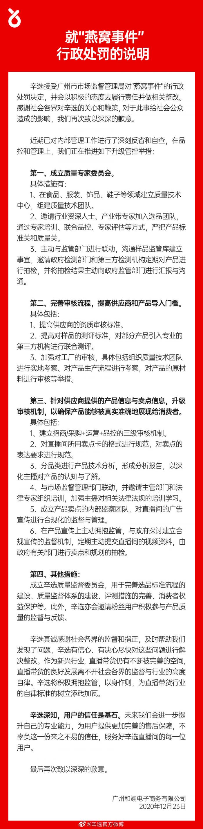 12月23日晚间,@辛选官方微博发布说明称,辛选接受广州市市场监督管理局对“燕窝事件”的行政处罚决定,并会以积极的态度去履行责任并做相关整改。辛选表示,近期已对内部管理工作进行了深刻反省和自查,在品控和管理上,正在推进如下升级管控举措:成立质量专家委员会;完善审核流程,提高供应商和产品导入门槛;针对供应商提供的产品信息与卖点信息,升级审核机制,以确保产品能够被真实准确地展现给消费者。
