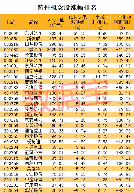 从二级市场表现来看,部分铸件龙头公司已率先大涨。证券时报·数据宝统计显示,12月以来已有9股累计涨幅在10%以上,包括东风汽车、新强联、日月股份、长城汽车、金雷股份等。新强联累计涨幅47.33%,于昨日创下历史新高。该公司主要从事大型回转支承和工业锻件的研发、生产和销售,前三季度实现盈利2.59亿元,同比增长359.35%。