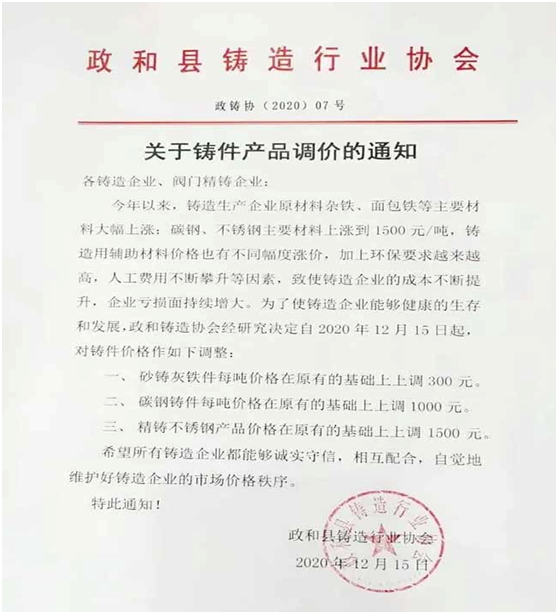 铸件价格大幅上涨已成必然趋势,为了使铸造企业健康的生存和发展,已有铸造协会下发调价通知。据政和县铸造行业协会发布的《关于铸件产品调价的通知》显示,由于铸造生产企业原材料杂铁、面包铁等主要原材料大幅上涨,铸造用辅助材料价格也有不同程度涨价,加上环保要求越来越高,人工费用不断攀升等因素,政和铸造协会经研究决定自2020年12月15日起,对铸件价格作如下调整: