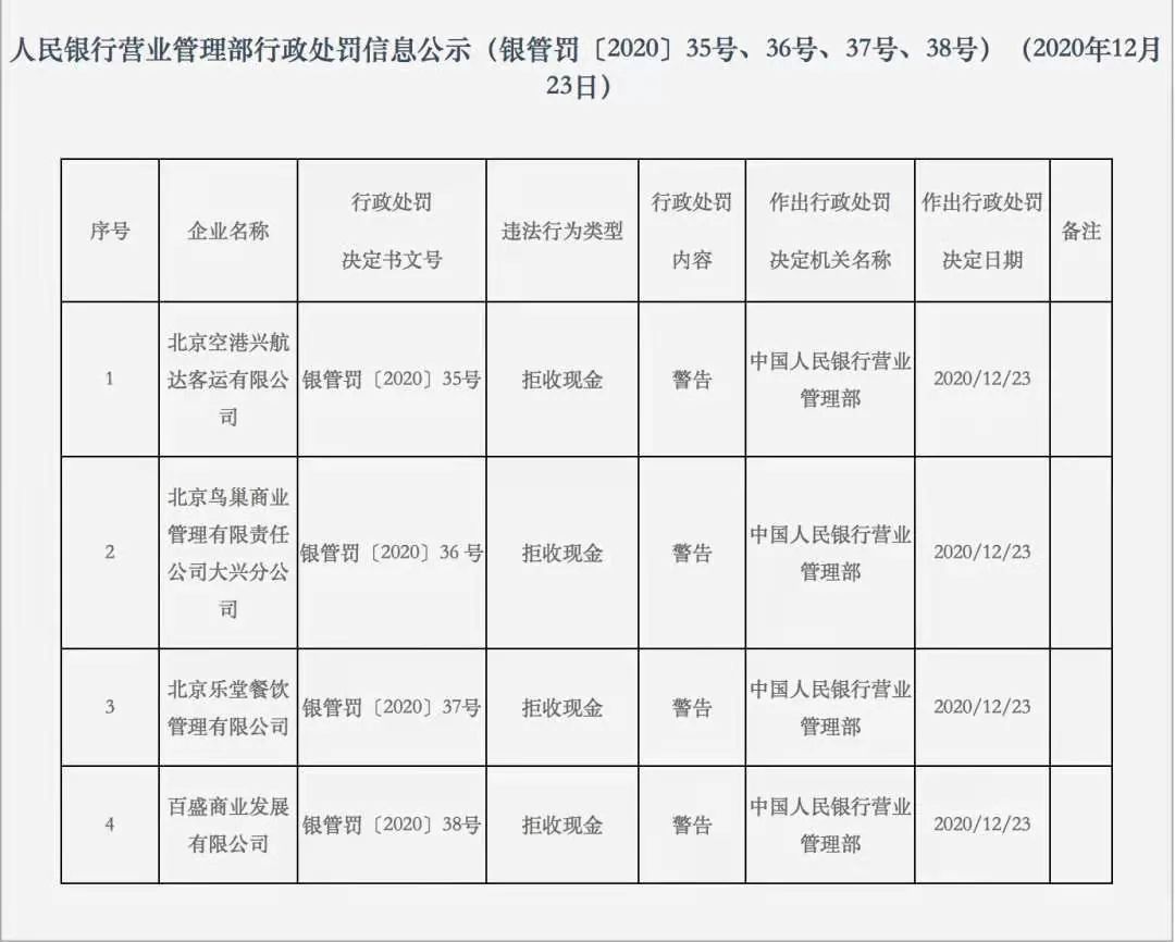 12月23日,中国人民银行北京营业管理部发布了行政处罚信息公示(银管罚〔2020〕35号、36号、37号、38号),北京空港兴航达客运有限公司、北京鸟巢商业管理有限责任公司大兴分公司、北京乐堂餐饮管理有限公司及百盛商业发展有限公司4家公司,因拒收现金被处以警告,作出上述行政处罚日期就是12月23日。