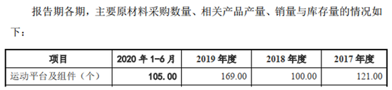招股说明书显示,2017-2019年及2020年上半年,运动平台及组件的采购金额分别为1348.61万元、1685.51万元、5653.02万元和2816.54万元。