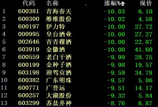 啤酒、黄酒等酒类股也难以幸存。会稽山、古越龙山、金枫酒业“黄酒三剑客”跌停,莫高股份、兰州黄河等啤酒股跌停。