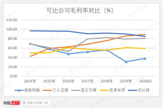 可以发现,2019年,可比公司的毛利率或与2014年时持平,或略有上升,更或是大幅上升,只有游族网络的毛利率在逆势下滑。