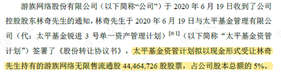 其中最大的一笔,是在2020年6月,林老板以9.06亿元的价格,将其持有的上市公司5%股权,转让给了太平基金资管计划。