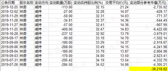 然而,2019年开始,风向大变,林老板突然就开始了持续不断的减持。2019年全年,合计减持了3.82亿元。
