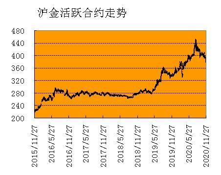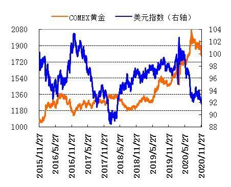 2020年11月,国际金价连续第四个月下跌,且跌幅扩大。11月27日COMEX黄金期货收报1754.5美元/盎司,当月累计跌幅5%。金价从8月中旬以来连续走低,主要受到经济复苏预期增强、疫苗利好提振投资者信心等因素影响。