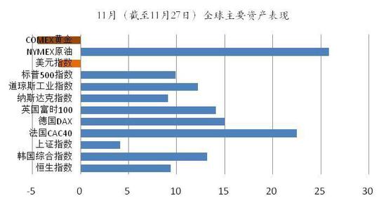 11月,美元走弱,美元指数下跌接近2.5%,黄金下跌约5%,美元和金价同时下跌的状况,与两者长期的负相关走势不符。我们分析,主要原因在于,美元和黄金都有避险属性,11月,反映市场避险情绪的指标—CBOE波动率有明显回落,体现出市场避险需求减弱。