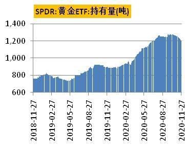 从全球最大的黄金ETF—SPDR黄金持仓来看,该基金黄金持仓11月27日为1194.78吨,连续一个半月从高位回落;较10月14日高位减少83.16吨,降幅6.5%。可以看出,黄金ETF是影响国际金价走势的重要力量。