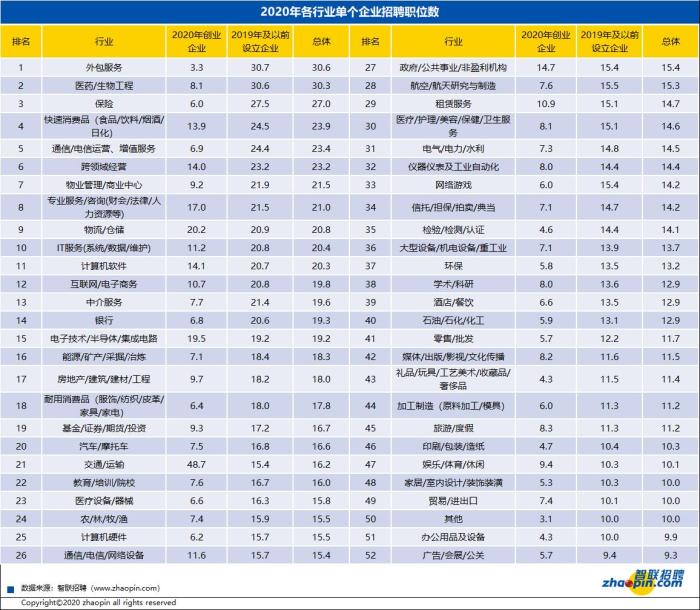 2020年各行业单个企业招聘职位数。智联招聘供图。