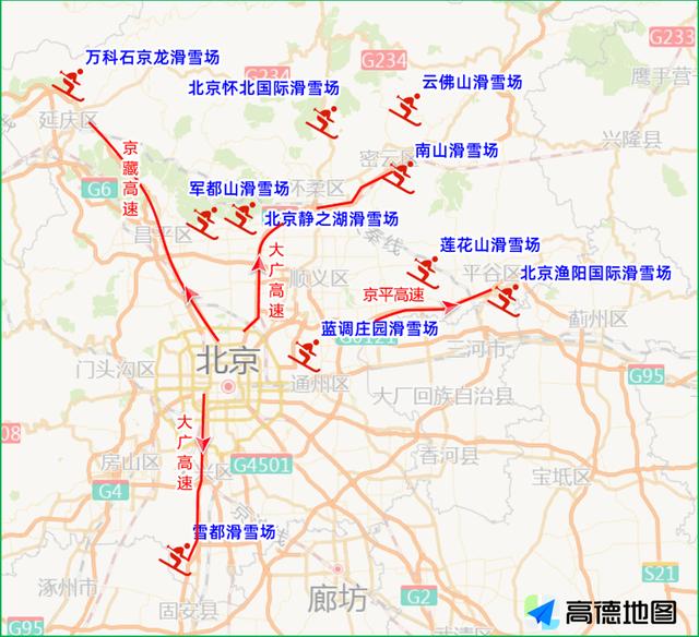 天气较冷,滑雪等冬季运动热度上升,去往军都山、南山、怀北、云佛山、渔阳、莲花山等滑雪场娱乐的客流量较大,滑雪场周边道路以及连接城区的京藏、大广、京平等高速公路车流量将有所增加。此外,周末期间自驾从京藏高速、京新高速去往崇礼滑雪娱乐的市民朋友也呈现增多的趋势,京藏高速、京新高速出现周六早间至上午出京、周日下午至晚间进京的潮汐车流。建议滑雪休闲的市民朋友错开出行高峰,以避免车多排队、寻找车位等烦恼。在此也提示市民朋友,多数滑雪场周边道路通行条件有限,遇车辆排队时请按序通行,不要借用对向车道逆行超车。