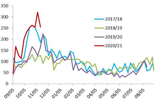 截至11月20日,巴西2020/21年度大豆播种进度为74.1%,低于去年同期的75.7%,也低于历史均值75.5%。由于巴西中西部地区的降雨不规律,而且南部天气干燥,导致今年巴西大豆播种出现非典型延迟,即使是已种大豆也未能得到充足的降雨,迫使一些农户重新种植。巴西大豆播种延迟可能导致晚收,并导致2021年初中国采购美国大豆的时间比往年更长。不过,尽管拉尼娜天气加剧了干旱,但是由于播种面积增加,巴西明年初收获的大豆产量仍有可能创下历史新高。