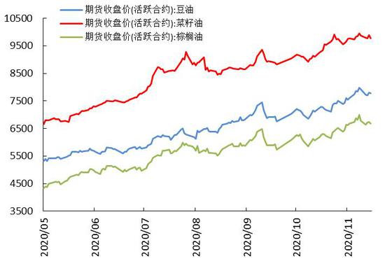 11月中上旬,由于出口持续强劲以及USDA报告利多,推动美豆大幅上涨。下旬由于传言国内榨利恶化洗船美豆,美豆主力期价承压整理。美豆期价涨至高位,从成本端上提振国内豆类油脂行情。棕油产地供需利多推动马盘偏强,国内豆油库存连续下降,11月国内油脂延续上涨行情。
