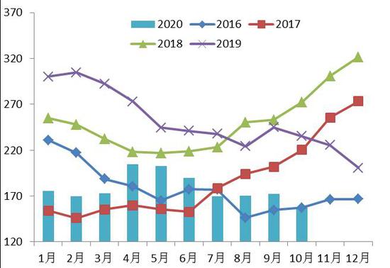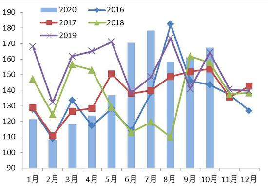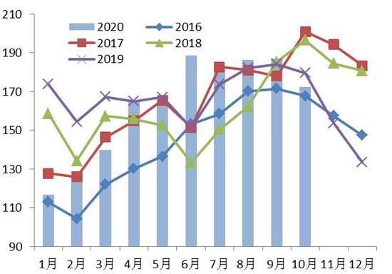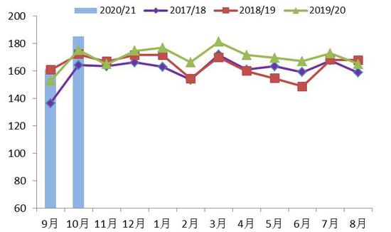 海关发布的数据显示,10月份中国大豆进口量为868.8万吨,较9月环比降11.25%;较去年同期增40.55%;2020年1-10月共累计进口大豆8321.7万吨,同比增17.72%。10月大豆进口环比下降主要由于巴西大豆出口季节接近尾声。目前,美国新豆收获上市,而巴西大豆货源见底,且近些周来中国已经加快采购包括大豆在内的美国农产品,以满足国内需求。且为履行中美贸易协议的采购承诺,后期中国进口的美国大豆数量预计将会提高。