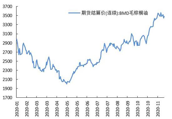 由于疫情限制及劳动力短缺,近几月产地棕榈油产量恢复偏慢,且出口需求强劲下,产地棕榈油库存重建缓慢,马来西亚10月棕榈油库存创三年低位。从船运调查机构ITS公布,马来西亚11月1-25日棕榈油出口环比降18.7%。印度节日旺季结束,需求转弱或将令棕榈油出口前景受限。MPOA发布的数据显示,2020年11月1-20日,马来西亚毛棕榈油产量环比下降10.51%,11月份棕榈油进入季节性减产期,且疫情仍未得到控制,预计马来西亚棕榈油仍处于降库存状态。