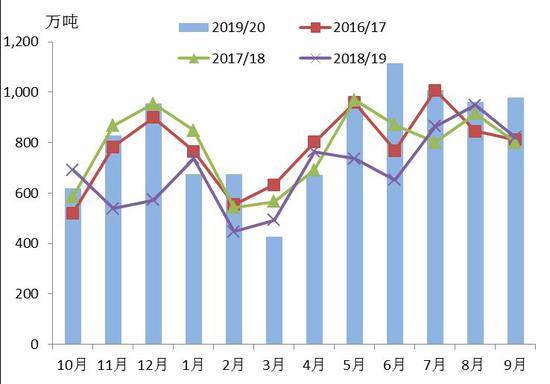 小结:在单产调降大于预期情况下美豆产量出现大幅下调,新季结转库存出现超出预期的调降。巴西新季大豆播种进度延迟,全球大豆供应收紧预期继续支撑美豆上行。10月国内大豆进口环比下降,随着美国新豆收获上市,而巴西大豆货源见底,且为履行中美贸易协议的采购承诺,后期美豆进口量预计将会提高。