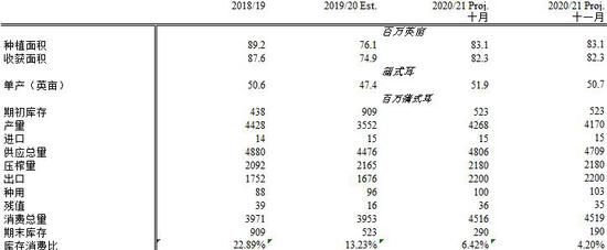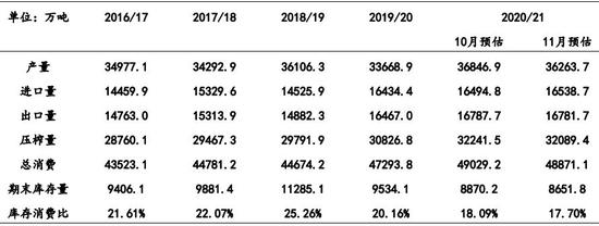 11月USDA供需报告,将阿根廷大豆产量调低250万吨至5100万吨,维持巴西大豆作物产量预估在1.33亿吨不变,中国大豆进口数据继续维持1亿吨的预估不变。美国2020/21年度大豆单产预估下调至每英亩50.7蒲式耳,产量预测值大幅调低0.98亿蒲式耳,至41.7亿蒲式耳,远低于分析师在报告前所预期的42.51亿蒲式耳。出口数据与上月保持一致仍为22亿蒲式耳。美国2020/21市场年度的年末库存将降至1.90亿蒲式耳,如果确实如此,将为2013/14年度以来最低。虽然美豆出口及压榨预估均维持不变,但美豆产量在单产调降大于预期情况下出现大幅下调,从而令新季结转库存出现超出预期的调降,本次报告对大豆市场影响利多。