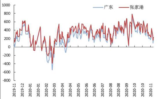 目前,沿海一级豆油现货基差在Y2009+360到420不等,较上月基本持平。中国积极采购带动美豆大涨至历史高位,国内大豆的进口成本抬升,油厂挺价意愿强。内外盘走强,提高市场采购积极性,豆油库存持续下降,基差显著走强。随着天气转冷,影响棕榈油需求,基差表现较弱。菜油方面,由于与豆棕价差较大,买家采购积极性不高,基差持续疲软。在消费旺季临近背景下,预计油脂基差将维持较高。