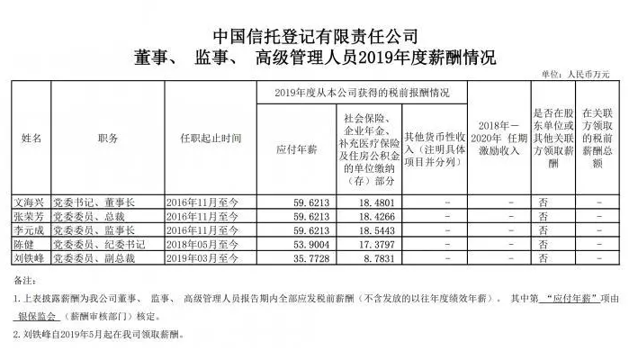 中国信登党委委员、纪委书记陈健的年薪为53.9004万元;党委委员、副总裁刘铁峰于2019年3月走马上任,自2019年5月起开始在中国信登领取薪酬,2019年的年薪为35.7728万元。