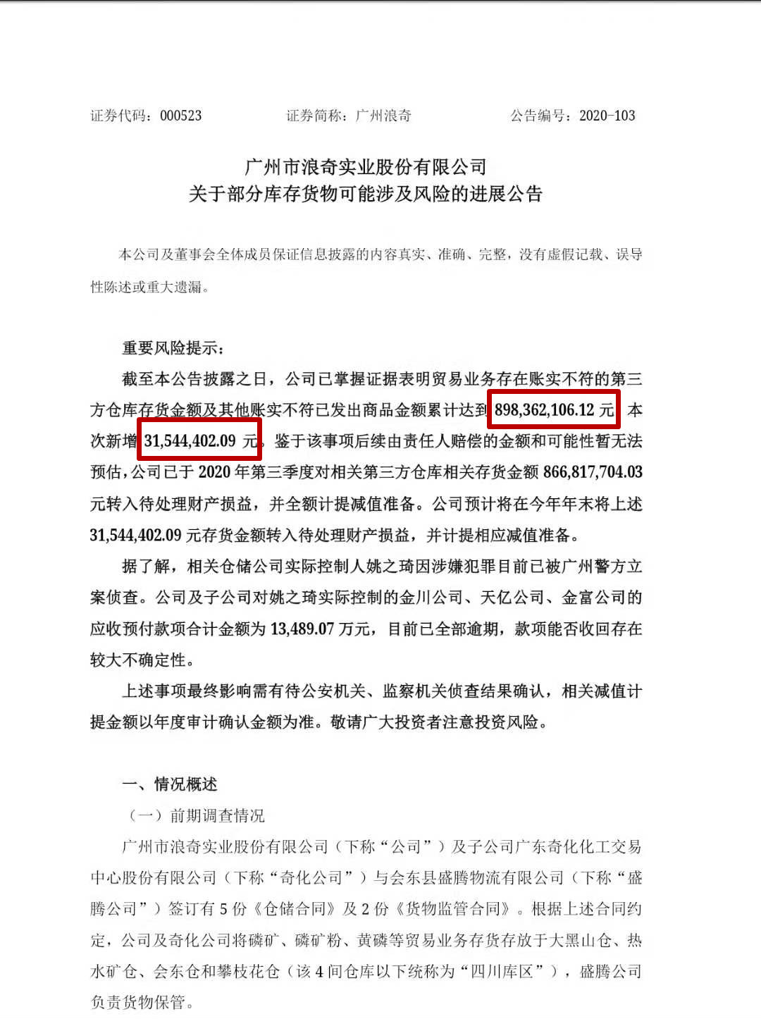 根据公告,广州浪奇于2020年9月发现部分贸易库存货物可能涉及风险后,立即组建存货清查小组对包括四川库区在内的全部第三方贸易仓库开展了全面核查。
