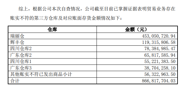 出乎意料的是,一个月后,广州浪奇存货失踪故事又有了新剧本。10月30日晚间,广州浪奇在回复关注函公告中称,公司截至目前已掌握证据表明贸易业务存在账实不符的第三方仓库及对应账面存货金额合计为8.67亿元。有问题的仓库除了瑞丽仓、辉丰仓之外,又新增了4个仓库。