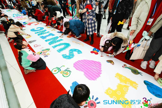当天,员工带领家属共同参观苏宁总部大楼,一起感受苏宁生日气氛。孩子们在长卷上欢乐涂鸦,为苏宁30周年送上真挚的祝福;一家三口到餐厅享受自助美食,宴聚苏宁;三代同堂到展厅了解苏宁故事,感受三十年发展脉络。除此以外,还有免费观影、蛋糕DIY等多重体验,共同为苏宁庆生。