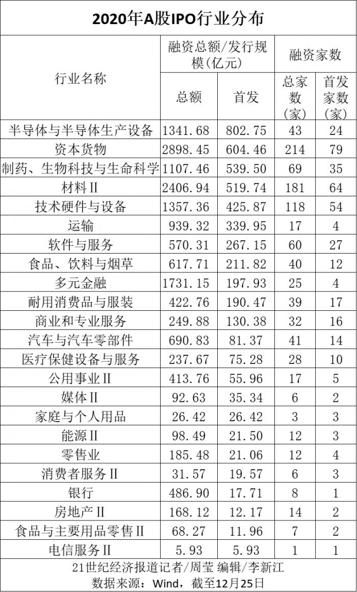 21世纪资本研究院统计数据显示,截至12月25日,半导体与半导体生产设备,资本货物,制药、生物科技与生命科学位列2020年IPO募资额行业前列,总募资额均超过500亿元,其中半导体与半导体生产设备募资额高达802.75亿元。