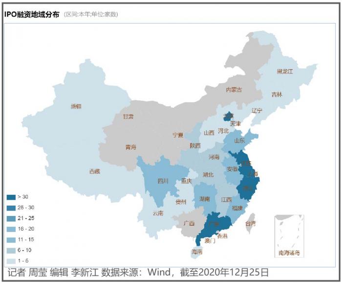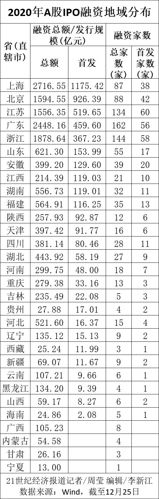 从地域上看,截至12月25日,2020年共有26个省级行政区在A股IPO上有所斩获。