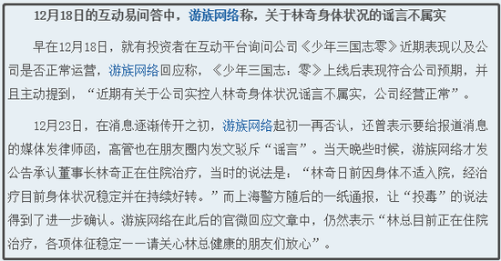 但是,在12月23 日,游族网络发布公告,称近期接到董事长兼总经理林奇家属的通知,林奇日前因身体不适入院,经治疗目前身体状况稳定并在持续好转。