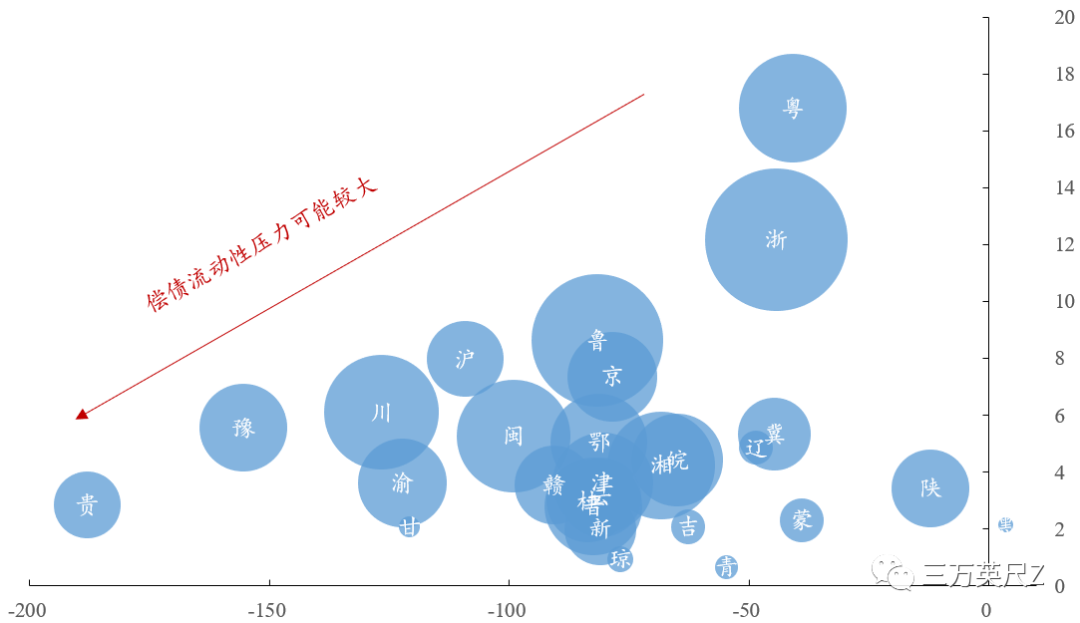 下图横轴为:永煤事件前后当地国企信用债发行量/偿还量变动幅度(pct);纵轴为:当地金融机构2019年末人民币贷款余额(万亿元,部分地区为本外币贷款余额,口径与国民经济公报保持一致);气泡大小为:当地国企2021H1信用债到期规模(亿元,考虑回售)。