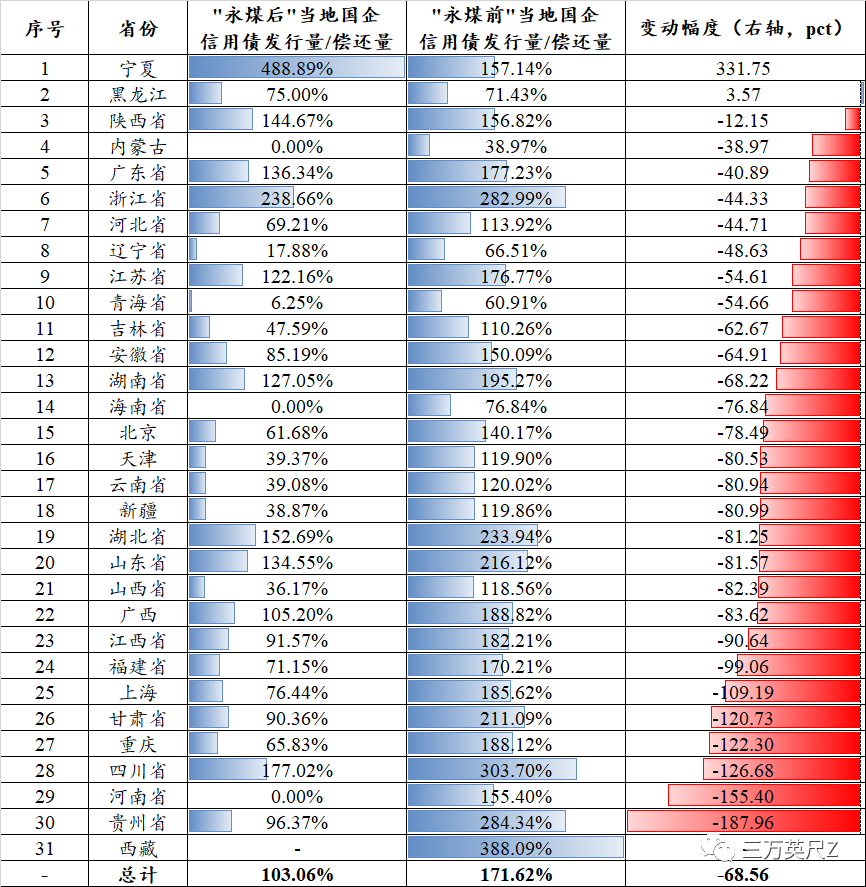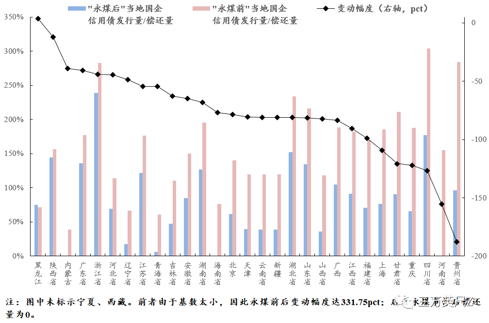 举例而言,“永煤前”河南省地方国企信用债发行规模/偿还规模达155.4%,但“永煤后”河南省地方国企未能成功发行任何一期信用债,该比率急剧下降至0%,变动达-155.4pct。