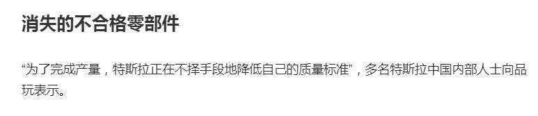 截图来源:新浪微博@品玩此前,12月25日,品玩微博发布报道《特斯拉中国乱象揭蛊 第三季》。该篇文章称,“‘为了完成产量,特斯拉正在不择手段地降低自己的质量标准’,多名特斯拉中国内部人士向品玩表示。”该篇文章将特斯拉中国形容为“血泪工厂”,并指出“特斯拉中国与特斯拉总部的对接,逐渐演化为朱晓彤与马斯克的单线对接,隔离了其他特斯拉中国高级职员与总部沟通的机会。”