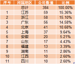 从地区来看,384家新上市公司来自27个地区。其中,新上市公司在10家以上的地区有11个,它们分别是江苏59家、浙江58家、广东56家、北京41家、上海37家、安徽20家、山东17家、福建13家、湖南11家、江西和四川均为10家。