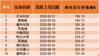 IPO日报初步统计,截至12月25日,相对发行价涨幅前十的公司分别是石头科技766.1%、爱美客490.75%、康华生物385.34%、思瑞浦266.09%、华峰测控233.43%、斯达半导220.27%、固德威209.47%、博杰股份205.63%、亿华通203.35%、康希诺197.49%。
